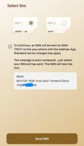 स्टेप :6 – आगे आपके सिम को सेलेक्ट करे और Sand SMS करे ( आपके आधार कार्ड में यह नंबर लिंक नहीं हैं फिर भी आप उस नंबर को चुने जिस में रिचार्ज है मोबाइल नंबर लिंक है नहीं हैं उस से कोई दिक्कत नहीं हैं)