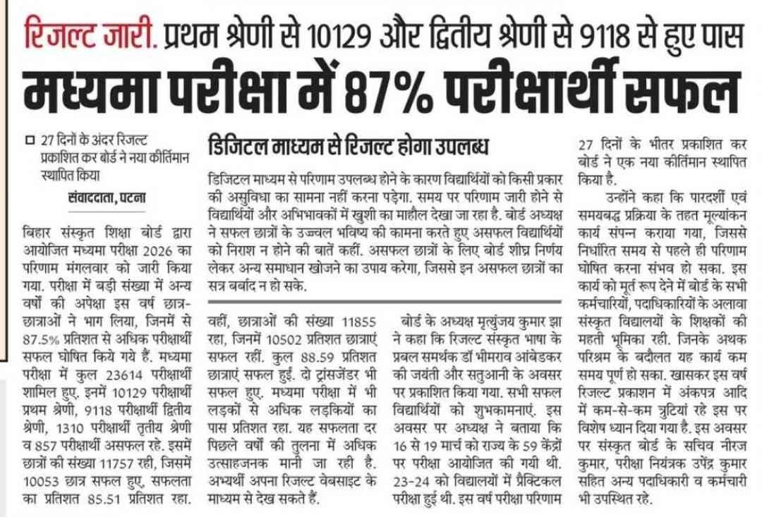 बिहार संस्कृत बोर्ड के अध्यक्ष सुनील कुमार ने आयोग की वेबसाइट पर रिजल्ट जारी होने के बाद कहा कि इस बार 23 हजार, 614 विद्यार्थियों ने परीक्षा फार्म भरा था। जिसमें से 11727 छात्रों ने सफलता पाई है। जिसमें से 10,129 प्रथम श्रेणी, 9118 द्वितीय और 1,310 तृतीय श्रेणी में पास हुए हैं। बता दें कि मध्यमा परीक्षा 2026, जो  16 से 19 मार्च, 2026 तक आयोजित किया गया था। संस्कृत बोर्ड के अध्यक्ष ने बताया कि पिछले साल की तुलना में इस छात्रों के पास प्रतिशत में बढ़ोतरी देखने को मिली है.पिछले साल पास प्रतिशत 84.05 रहा था। वहीं इस साल ये 3 प्रतिशत बढ़कर 87 हो गया है।