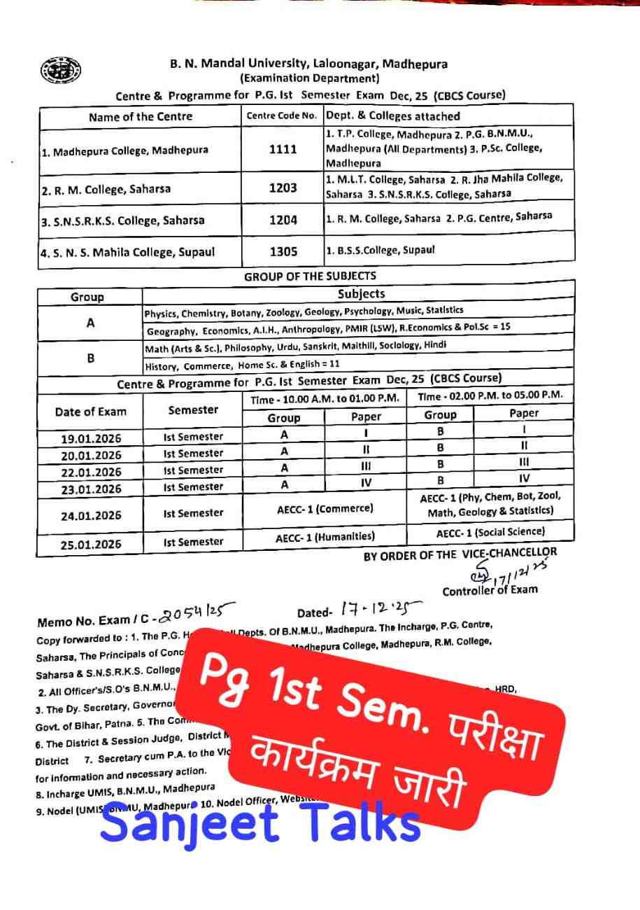बीएनमयू पी.जी प्रथम सेमेस्टर का परीक्षा कार्यक्रम जारी कर दिया गया है, कार्यक्रम के अनुसार आप सभी का परीक्षा 19 जनवरी, 2026 से शुरू होगा और 25 जनवरी, 2026 तक परीक्षा आयोजित किया जाएगा, जिसके लिए एडमिट कार्ड भी 4 दिन पहले जारी किया जाएगा।