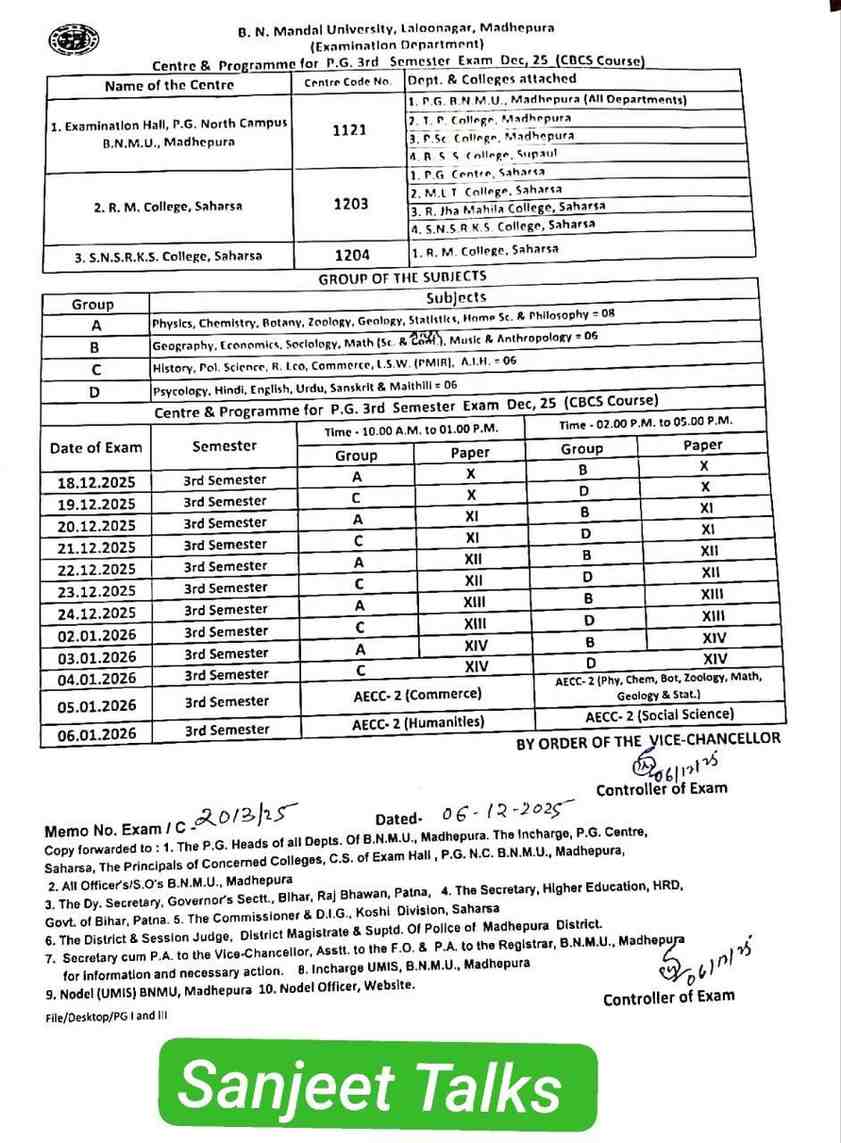 BNMU Pg 3rd Semester Exam Routine And Centre List 2024-26 (बीएनएमयू ने पीजी तृतीय सेमेस्टर का परीक्षा रूटीन और सेंटर लिस्ट किया जारी, जान लीजिए सम्पूर्ण जानकारी)
