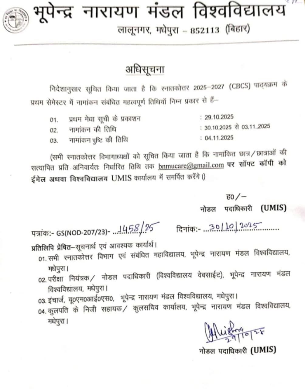 भूपेंद्र नारायण मंडल यूनिवर्सिटी मधेपुरा में पोस्ट ग्रेजुएशन के लिए अगर ऑनलाइन प्रक्रिया 11/09/2025 से शुरू हुआ था और अंतिम तिथि 05/10/2025 तक था, अगर आप भी इसमें आवेदन किए थे तो जिसका आज फर्स्ट मेरिट लिस्ट 29/10/2024 को जारी किया जाएगा, इसके बाद आपका कॉलेज में एडमिशनजो होगा इस दिन से 30/10/2025 से 05/11/2025 तक एडमिशन लिया जाएगा, जिस कॉलेज में आपका नाम है, उस कॉलेज में एडमिशन ऑफलाइन किया जाएगा |