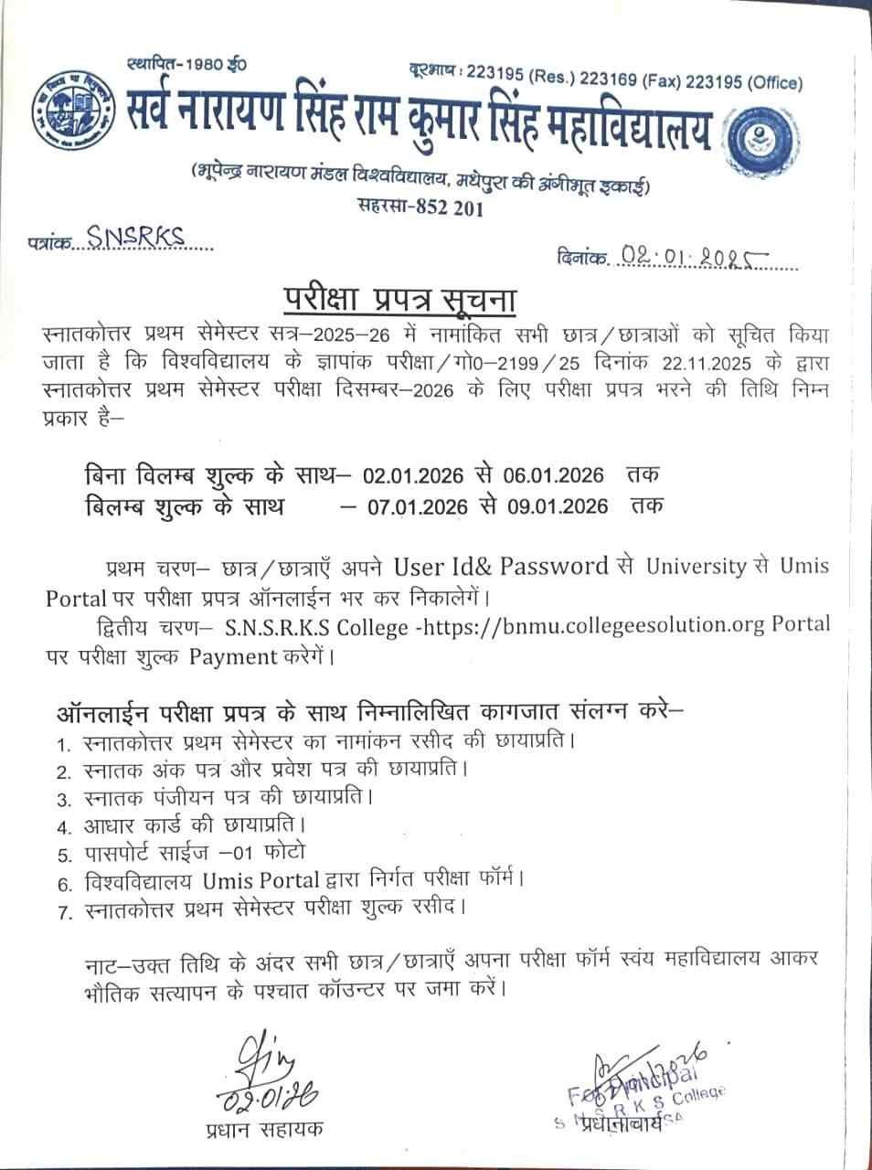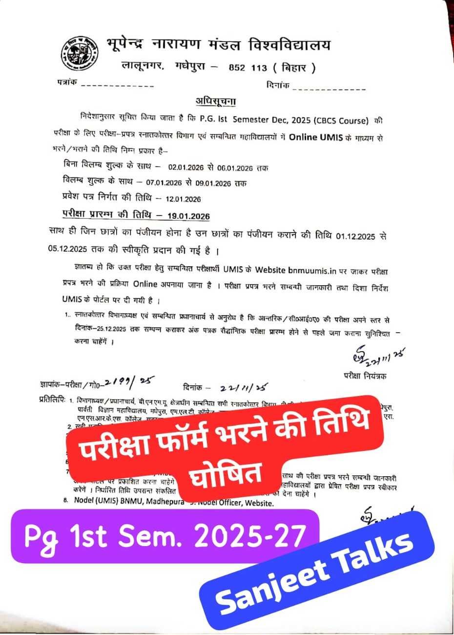 BNMU में पीजी प्रथम सैमेस्टर के लिए परीक्षा फॉर्म भराना शुरू हुआ, ऐसे भरें – BNMU Pg 1st Semester Exam Form 2025