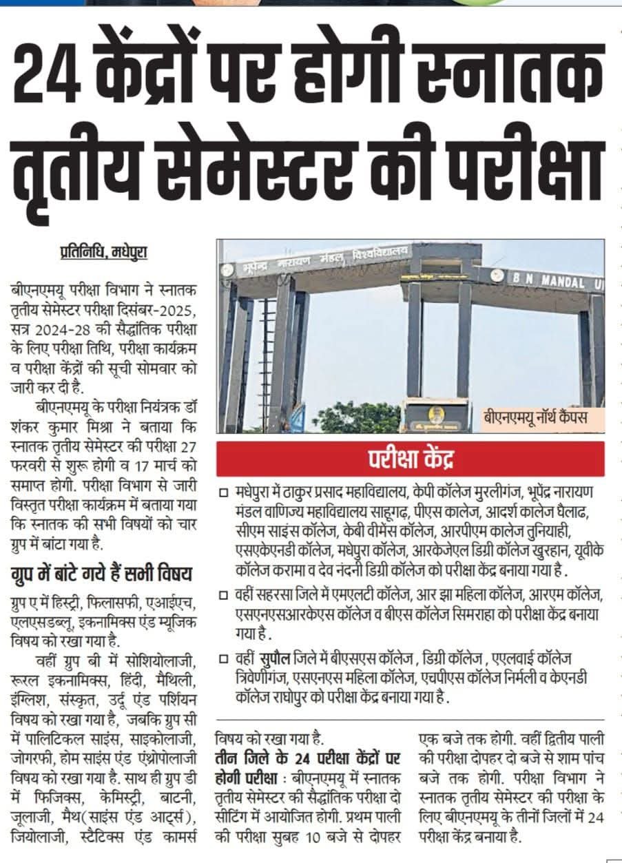 बी.एन. मंडल विश्वविद्यालय, मधेपुरा द्वारा स्नातक चतुर्थ सेमेस्टर (सत्र 2024-28) की परीक्षा तिथि एवं परीक्षा केंद्रों की सूची जारी कर दी गई है। यह परीक्षा 27 February से शुरू होकर 17 March, 2026 तक चलेगी। सभी परीक्षाएं दो पालियों में आयोजित की जाएंगी।