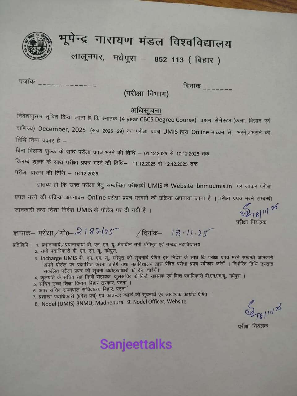 BNMU में 1st सैमेस्टर के लिए परीक्षा फॉर्म भराना शुरू हुआ, ऐसे भरें – BNMU UG 1st Semester Exam Form 2025-29
