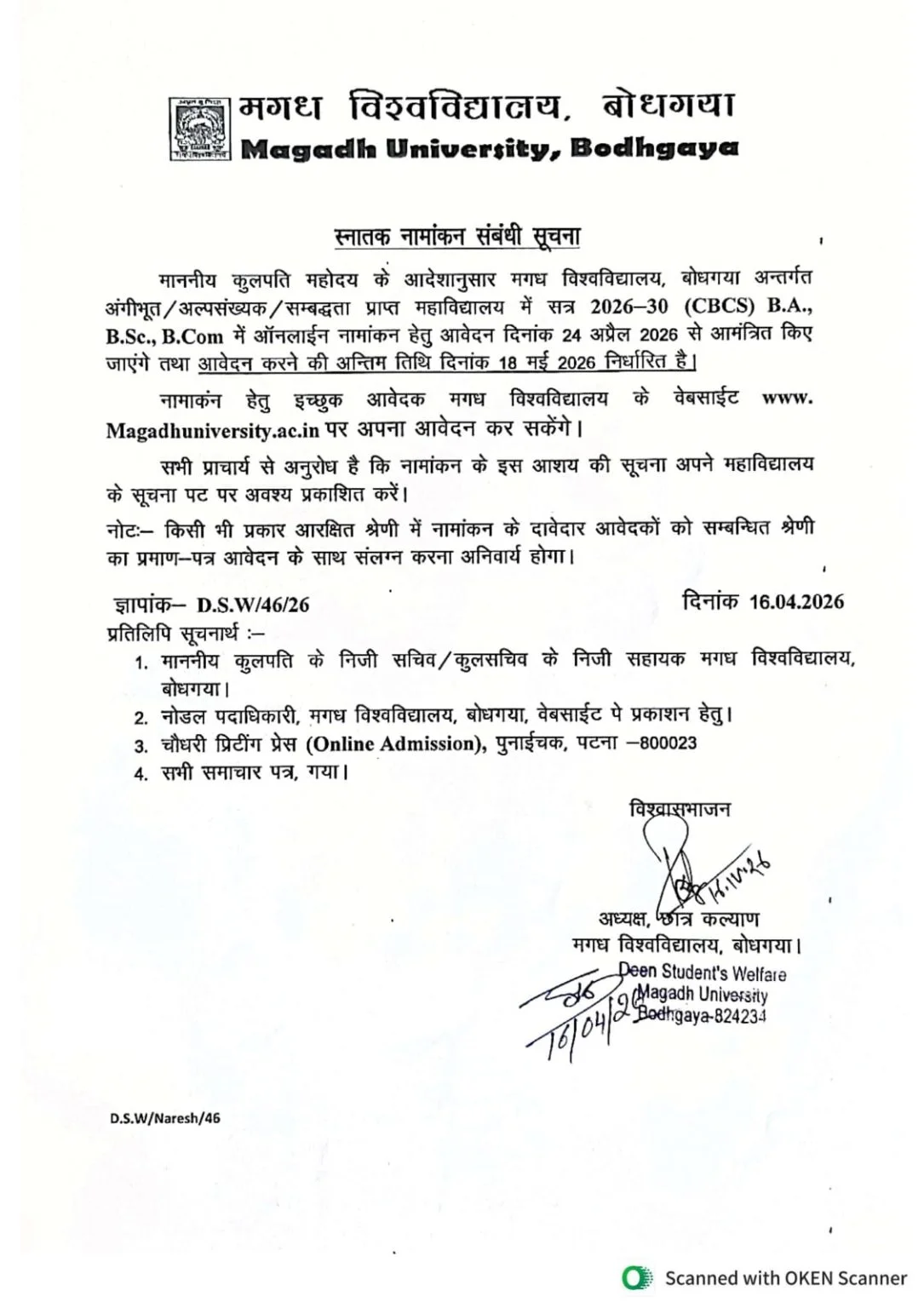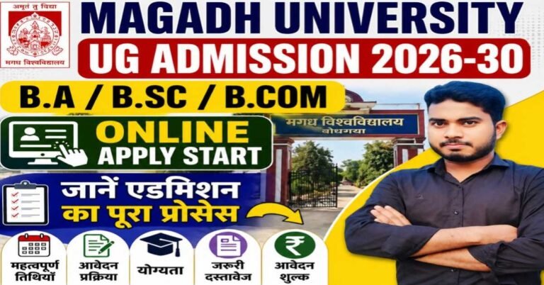Magadh University UG Admission 2026-30 Apply Online Start – मगध यूनिवर्सिटी में BA BSC BCOM में एडमिशन के लिए ऑनलाइन आवेदन शुरू जो भी इच्छुक विद्यार्थी हैं वो ऑनलाइन आवेदन कर सकते हैं, 24 अप्रैल, 2026 से 18 मई, 2026 तक।